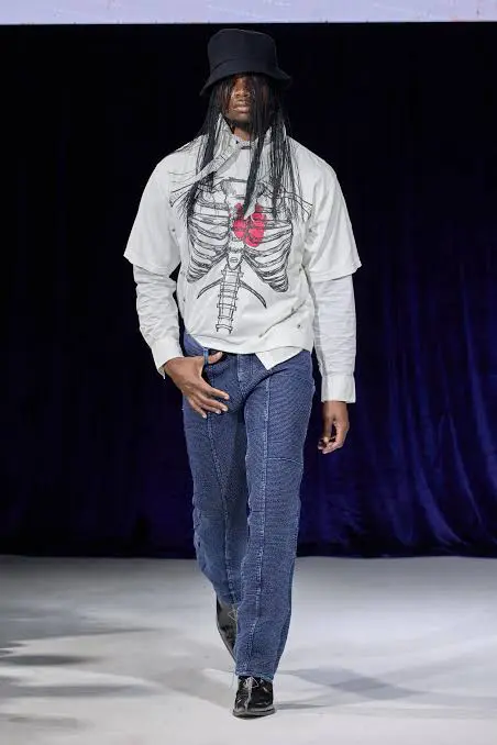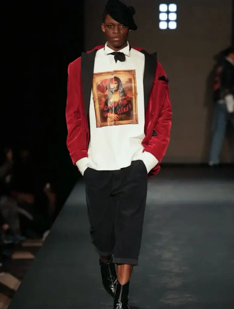 If there’s anything Romeo Hunte knows how to do well, it’s outerwear. The show’s second act belonged to it. Sleek, boldly colored trench coats commanded attention, while sweater vests bedazzled with tiny locks — reminiscent of those fastened to the Brooklyn Bridge — added a distinctly New York texture. Black furred coats of varying lengths followed, dramatic yet controlled. A subtle Parisian thread ran through the styling: berets tilted just so, and a graffiti-ed Mona Lisa splashed across hooded blouses and the backs of jackets, merging European iconography with Brooklyn grit.